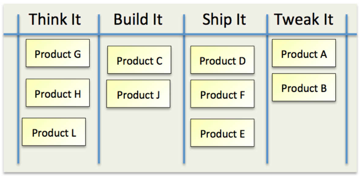 스포티파이는 개발하고 있는 제품들의 단계를 매니지먼트 관점에서 가시화하기 위해서 칸바보드로 현황판을 만들어 공유합니다. 아래 처럼 말이죠.