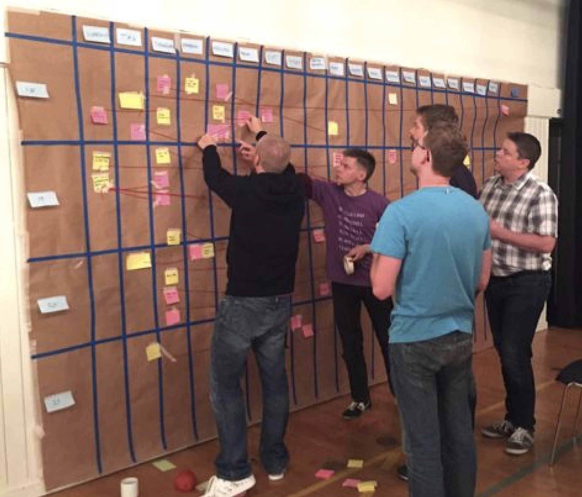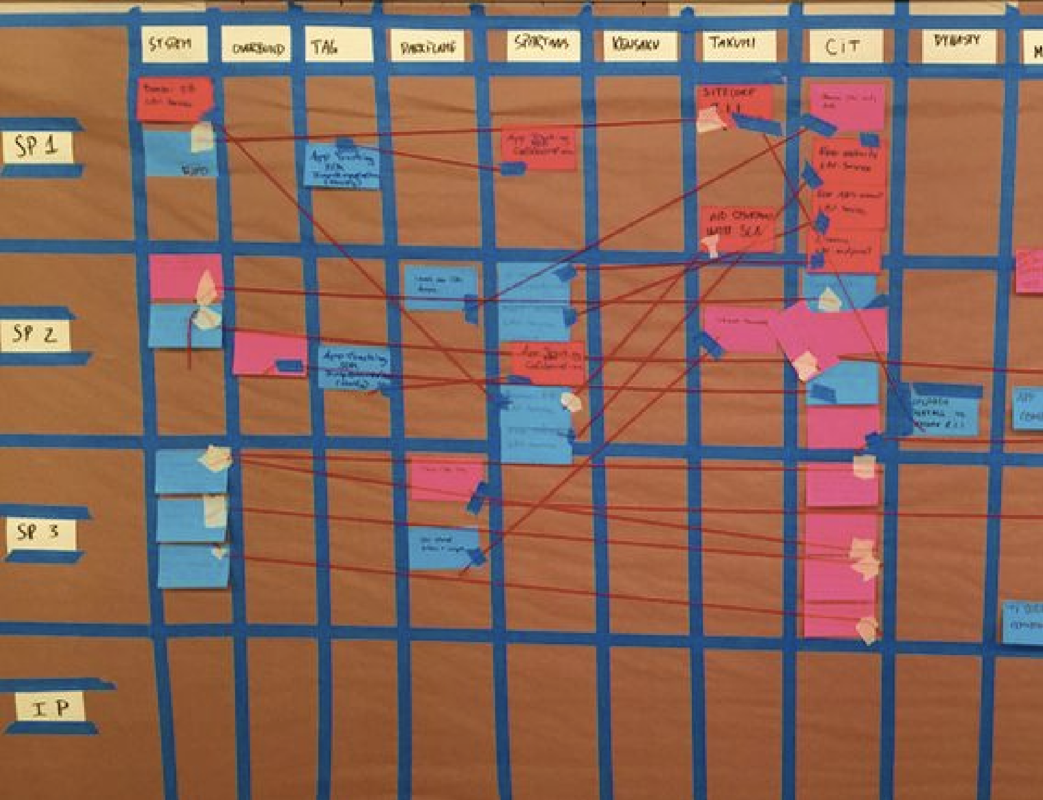 각 열은 팀이고 각 행은 스프린트(2주)입니다. 메모는 파란색에서 분홍색까지 종속성을 나타냅니다. "THIS(파란색 스티커)를 전달하려면 THAT(핑크색 스티커)가 필요합니다." 어떤 스프린트가 누구에게 전달될 것인지에 대해 많은 토론과 협상이 있음을 알 수 있습니다.