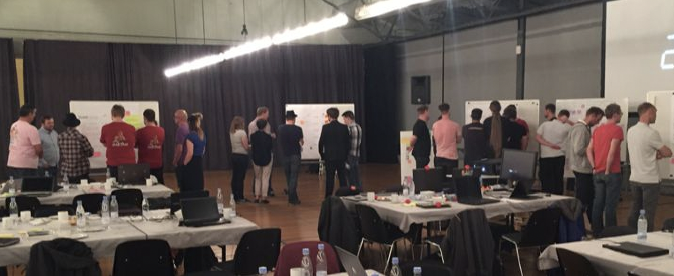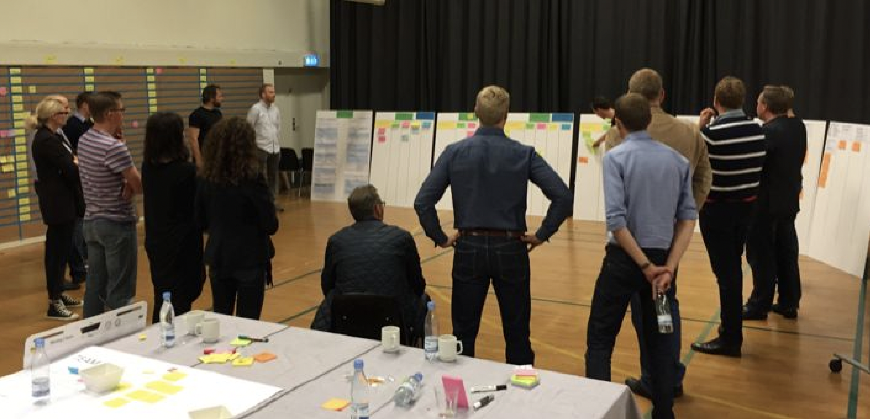 그는 큰 7.5분 타이머를 시작하고 프레젠테이션이 시작됩니다. 각 플래닝 보드 주위에 소그룹이 형성되어 해당 팀을 위한 계획(그들이 제공하려는 내용과 그 이유)을 듣고 토론합니다.