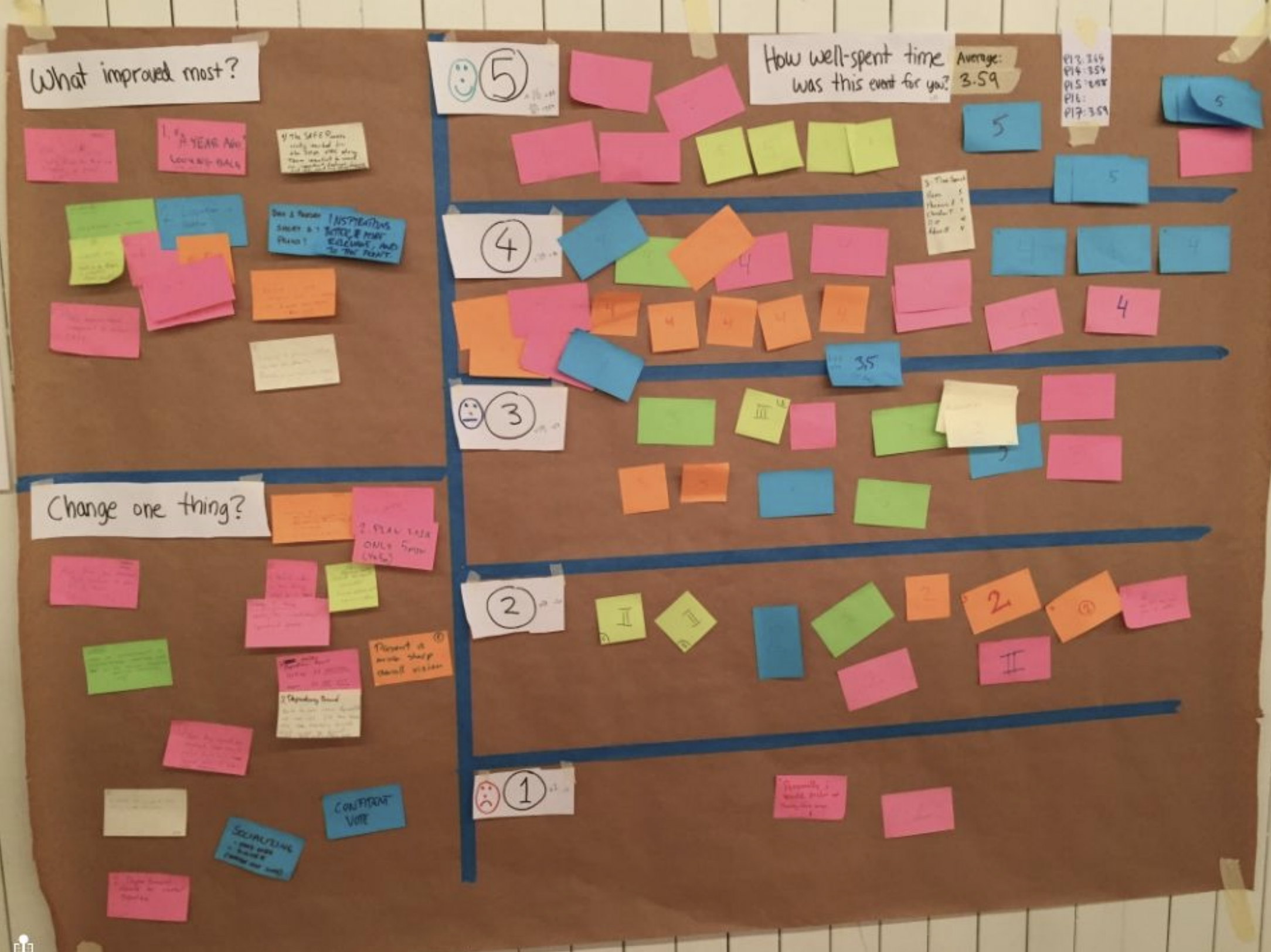 모든 사람이 자신의 발언을 한 후에는 한 걸음 물러나서 보드를 보고 패턴과 주제를 식별합니다. 대부분의 사람들은 이벤트를 좋아했으며(대부분 4와 5) 시간을 잘 보낸 것으로 간주했습니다.